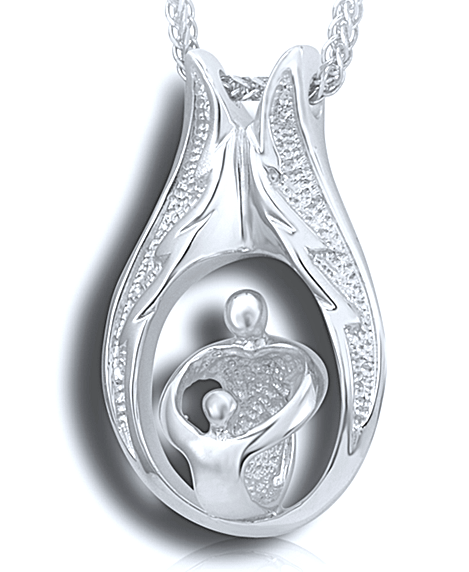 Ce magnifique pendentif représente un adulte et un enfant enlacés par des ailes d'ange. Le cadre des ailes d'ange présente des bords en relief polis qui se fondent harmonieusement dans le bas du pendentif.