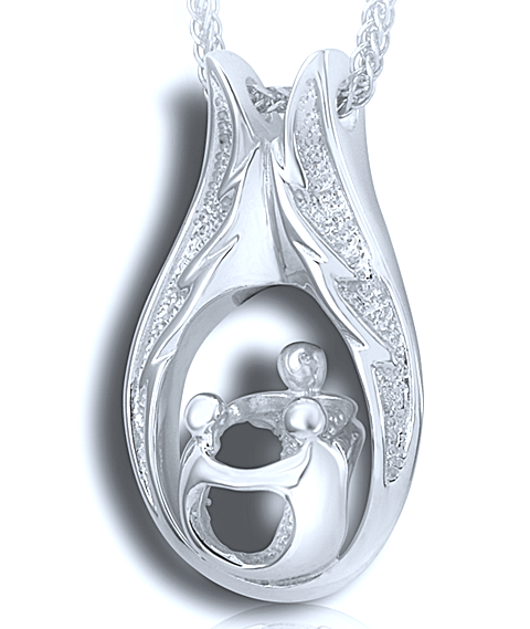 Ce magnifique pendentif familial représente un adulte et deux enfants enlacés par des ailes d'ange. Le cadre des ailes d'ange présente des bords en relief polis et texturés qui se fondent harmonieusement dans le bas du pendentif.