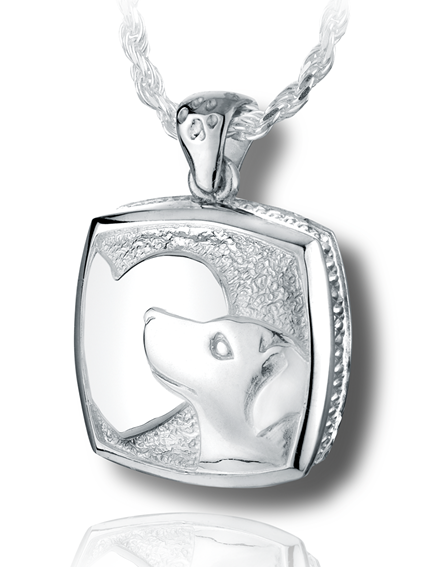 This cushion style pendant shows the dog in front of a heart with textured background. This pendant also has a tiny paw print on the bail where the chain goes through and lots of room for engraving on the back.