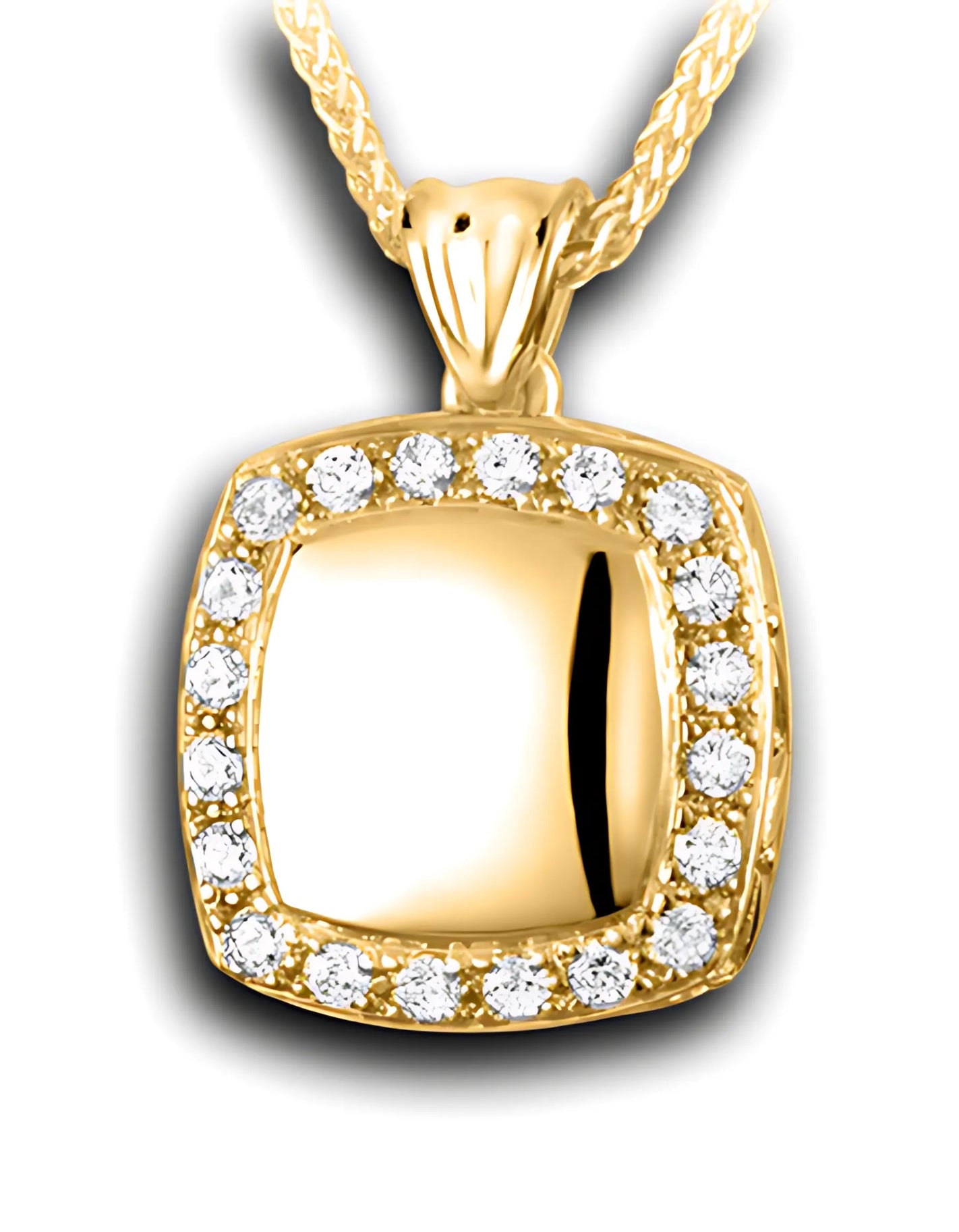This Cushion design is one of our most brilliant pieces. High polished center and a frame of 20 bead set Cubic Zirconia. Along the side is a motif of leaves and berries that work their way to the classic bail for the chain.