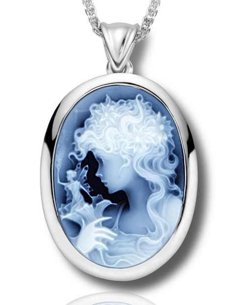 There are not enough word to describe the beauty and detail of this Cameo. From the delicate flowers in her flowing locks of hair to the tiny fairy sprinkling Pixie dust in the wind, this cameo is truly remarkable.