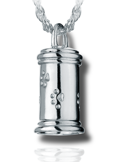 A larger version of the traditional pet urn with more pronounced ribs on top and bottom. Tiny paw prints work their way around the pendant.
