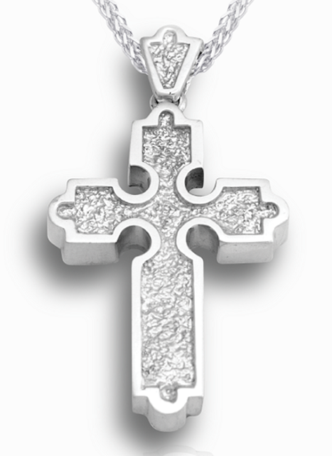 The Roman Cross is one of our larger items. Bold contours with a high polished rim and sand textured background. This cross also comes with a bail to match the design.